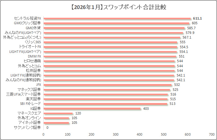 2025年スワップポイントの年間合計額で言えば、【5位】という冴えない順位になってます。んで、2026年1月20日には、1日24.2円という最恐クラスのスワップポイントになってるので、2026年は期待できそうにありませんねぇ。
