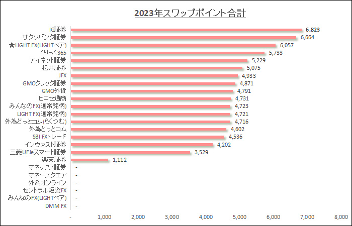 LIGHTペアは、2023年6月26日に取扱いが始まったので、現在から2023年7月分までのスワップポイントの推移と他社と比較したグラフを紹介します。