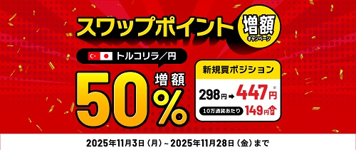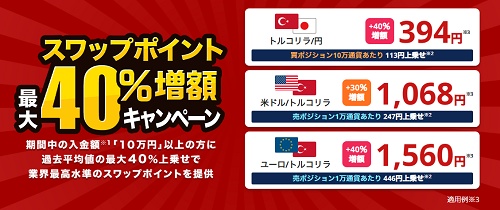 今現在実施中のキャンペーンを高い順に紹介しますので、上から順にトルコリラを買っていけば、スワップポイント額を最大化できます。