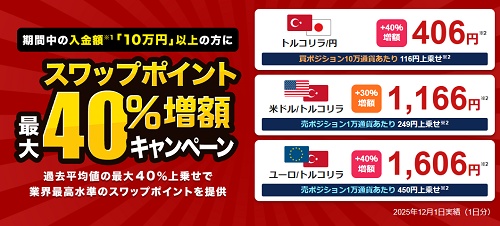 キャンペーンの画像には、40%増額って書いてあるんですけど、外為どっとコムの場合、1万通貨あたり1日11.6円(固定)が増額されるキャンペーンです。外為どっとコムの平均が29円なので、1日40.6円(スワップ付与時には1円未満切り捨て)。
